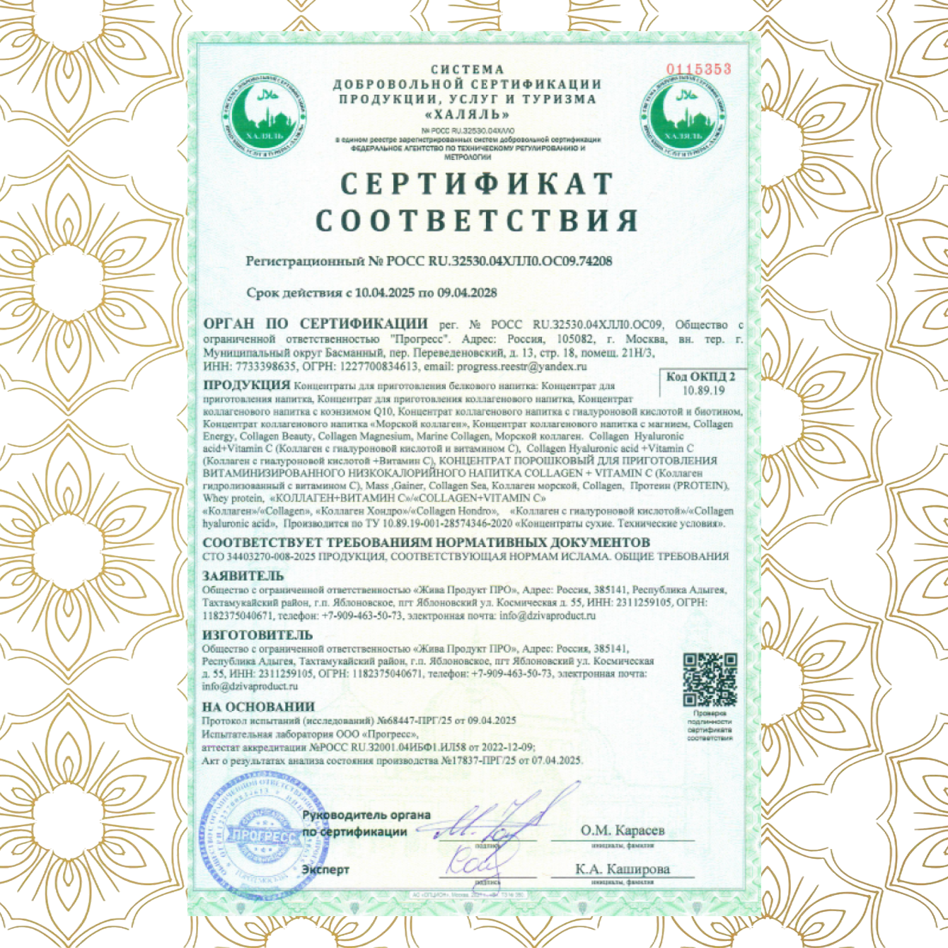 Мы получили сертификат халяль на нашу биологически активную добавку к пище "Коллаген говяжий пептидный гидролизованный". Это скрупулёзная проверка качества нашего продукта. «Халяль» - прежде всего то, что потребители могут довериться качеству продукта, так как в составе нет запрещенных красителей и добавок.