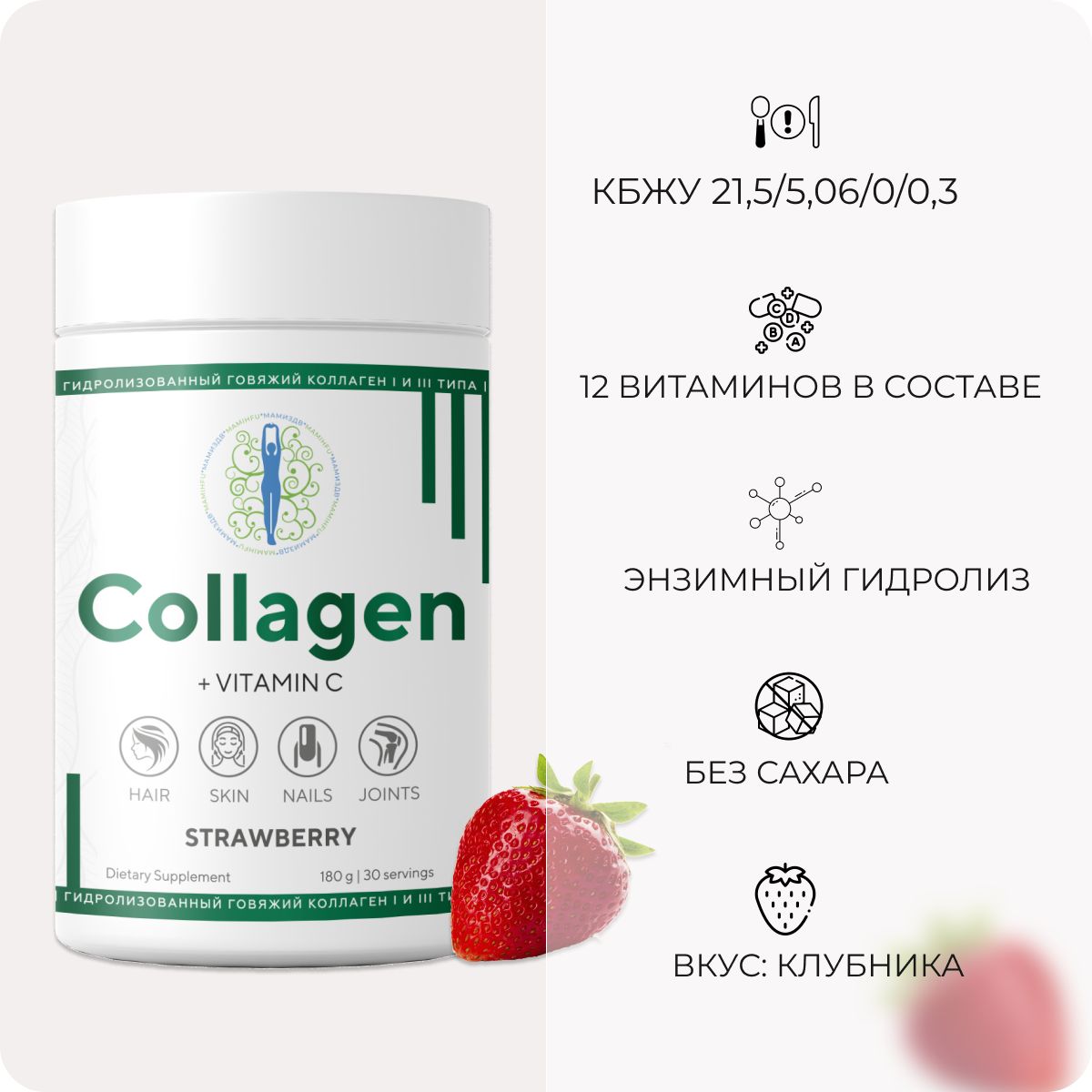 Представляем вашему вниманию пептидный коллаген МАМИ с витамином C в удобной упаковке — 30 порций порошка с клубничным вкусом. Этот продукт создан специально для поддержки здоровья суставов и связок, обеспечивая вашему организму необходимые элементы для восстановления хрящевой ткани.