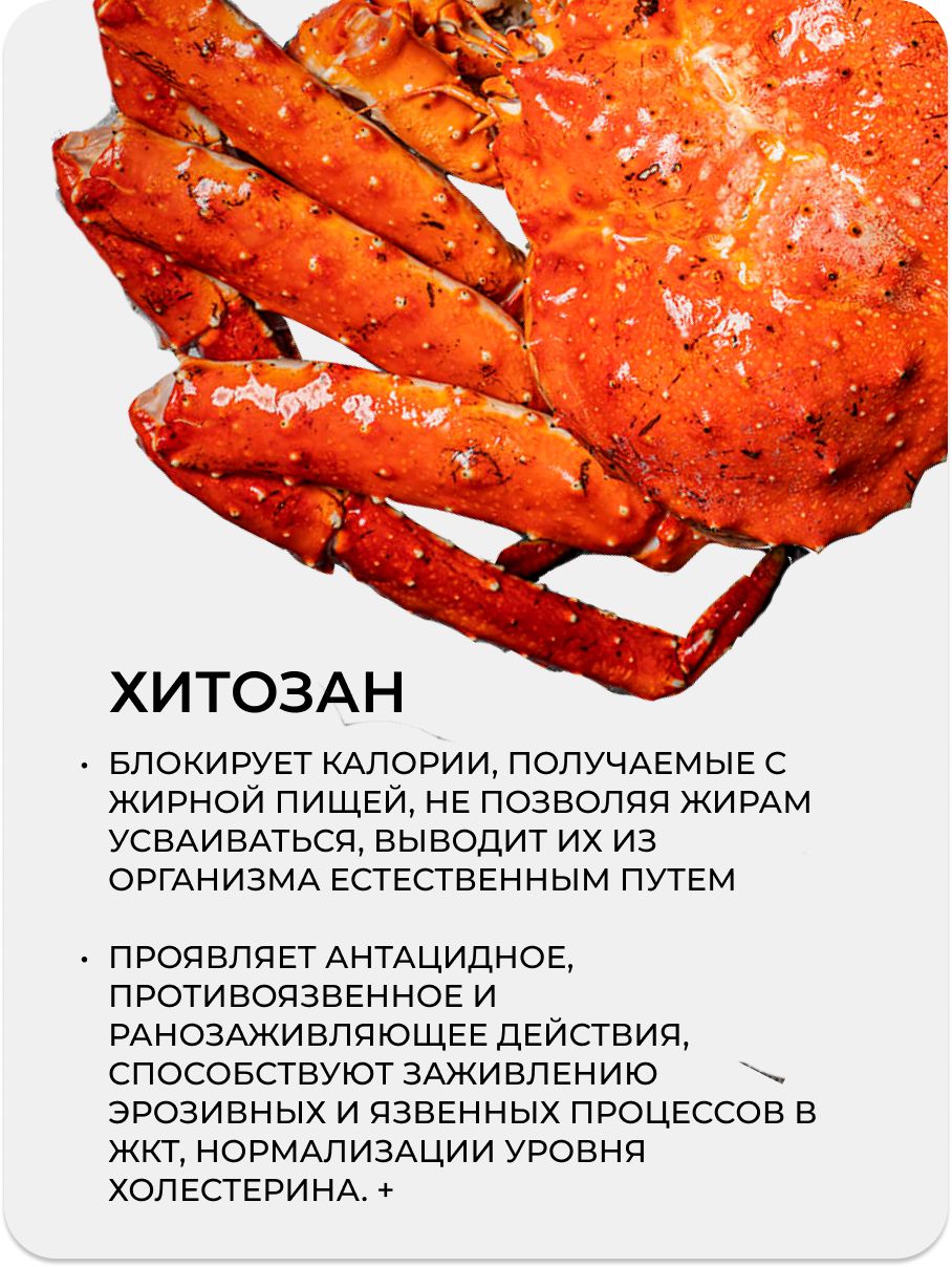 - Хитозан, полученный из панциря камчатского краба, действует как мощный природный сорбент. Он эффективно связывает и выводит молекулы жира (в 10-12 раз больше собственного веса), что помогает контролировать его потребление с пищей, а также стимулирует рост полезной микрофлоры и способствует детоксикации.